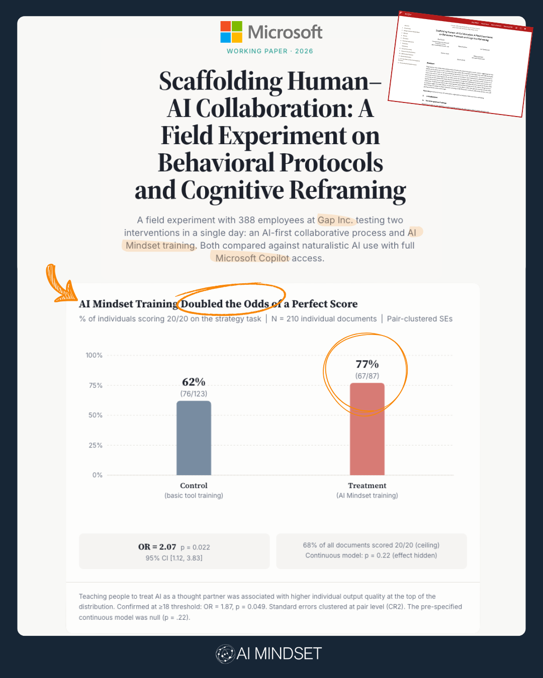 Your AI tool is not the bottleneck. Microsoft - the company that makes Copilot - just proved it. The tool didn't determine whether people did excellent work. The training did. Stop asking "which AI tool should we buy?" Start asking "how are we training people to use the one we already have?"